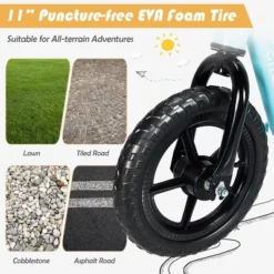 - High Quality EVA Foam Wheels: The bike is equipped with two 11” EVA foam wheels which are wear-resistant, puncture-free and suitable for all terrains, such as brick road, asphalt road, cement road and boardwalk, etc. Kids can enjoy ex citing adventures on different roads but attain same happiness.