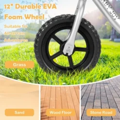 - High Quality EVA Foam Wheels: The bike is equipped with two 12” EVA foam wheels which are wear-resistant and suitable for all terrains, such as brick road, asphalt road, cement road and boardwalk, etc. Kids can enjoy ex citing adventures on different roads but attain same happiness.