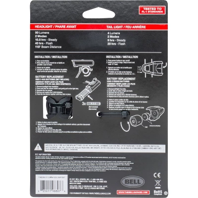 The Bell Lumina 325 Light Set gets you great visibility at a great value, featuring a 90-lumen headlight and 4 Lumen taillight. The headlight uses three AAA batteries for ease of use and long life. The taillight uses two included CR2032 batteries. Both of the lights use silicone straps for easy tool-free installation.