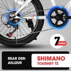 - ¡¾7-Speed Drivetrain¡¿¡ª Classic 7 speeds rear derailleur creates the perfect bike to allow riders to easily tackle climbs. With Shimano twist shifter, kids can quickly select a gear for every terrain, and handle their imagination. It is truly the perfect bike to inspire young riders to climb higher and tackle the downhills freely.