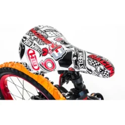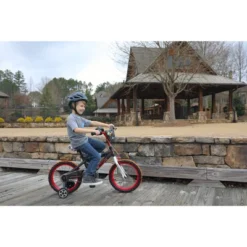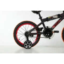 This Boys 16- inch Hot Wheels bike by Dynacraft comes with a sturdy steel frame and a Turbo Revvin’ Grip that features light and sound. It also includes an awesome racing shield, as well as coaster brakes, rear caliper brakes, and training wheels. The training wheels on this 16-inch boy’s bike can be removed easily once your child has mastered the art of bike riding. The sleek seat with alloy quick release means its height can be adjusted at any time. This 16-inch kids bike also features a cool black, red and white design.