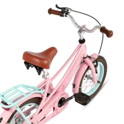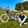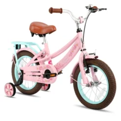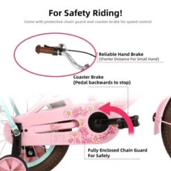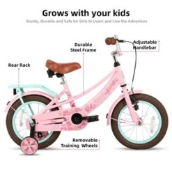 The JOYSTAR Lola Girls Bike is a well-designed bike for children, featuring a sturdy steel frame, adjustable saddle and stem height, and low gearing for easy pedaling. It comes with a protective chain guard, and dual spring saddle for comfort. The bike is equipped with both rear coaster and front caliper brakes, and includes accessories like rear rack. It also has a colorful design that appeals to young girls.