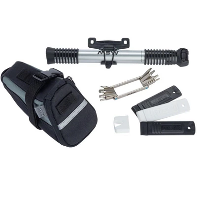 The Ride and Repair Kit provides everything needed to fix a punctured tire. The kit includes an eight-piece multi-tool, glueless tire patch kit, three tire levers, inflation equipment, and a seat bag to put it all in.