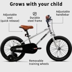 Watch your little one conquer the sidewalks with the Petimini 16 Inch BMX Style Kids Bike with Training Wheels. With short-reach brake levers, lower stand-over height, a protective stem pad, and removable training wheels, this BMX-style bike is fun and safe for kids.This bike’s tough HI-TEN steel frame exceeds CPS standards and is durable and elegant, providing long-lasting reliability and keeping kids’ rides smooth and easy. Removable training wheels will support your little one as they learn to master 2 wheels. High-quality rubber bike tires provide more stability and comfort while your kiddo gets used to the ride.The saddle of the bike is breathable, soft, and ergonomically designed with a parent handle to support your child along the ride. The saddle height can be easily adjusted without tools to adjust as your child grows. A built-in front hand caliper brake and rear coaster brakes provide more sufficient stopping power and safety than bikes with only a hand brake. This 16-inch bike is designed for children 4-7 years old or 38-48 inches tall. Rely on the safety and durable construction of the Petimini 16 Inch BMX Style Kids Bike with Training Wheels.