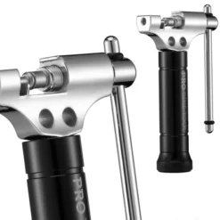 PRO BIKE TOOL The heavy duty tool is available in three stylish colours; Black, Red, and Silver! Leverage – The push pin lever is extra long to help you push out the most stubborn of chain pins. We have also designed a thick handle to help with leverage which also includes a spare pin bar. In total there are 4 push pins available. On either end of each push bar you will find a push pin with which we include two push pins bars; one in the handle and one readily installed.