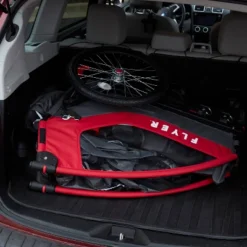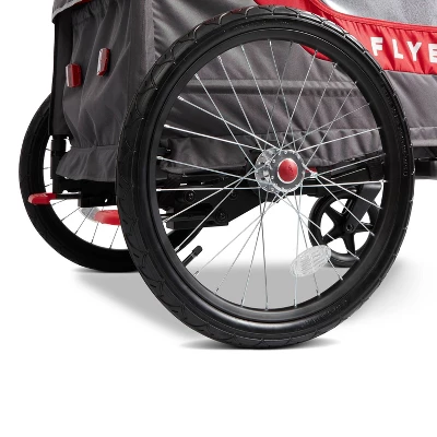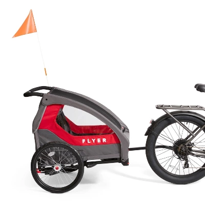 Perfect for families on the go, the Flyer™ DuoFlex adds ease and convenience to any biking adventure! This bike trailer and stroller features an innovative Fold ‘N Roll™ design which allows it to fold compactly and roll into storage when not in use. The front caster wheels provide nimble steering and maneuverability, even when folded! The included tow arm and universal coupler allow the trailer to attach to most bikes and Flyer™ eBikes (Flyer L885 bike trailer adapter sold separately). Simply mount the arm and you’re ready to ride! This versatile bike trailer also transforms into a stroller in seconds. To switch modes, remove the bike arm and attach the front casters. The bike arm stores in the holster while in stroller mode. The mesh cover protects riders while the clear vinyl windows offer unobstructed views of the adventure ahead. When the weather is nice, store the roll-up weather guard in the storage pouch. Up to two riders can enjoy the recessed footwell, padded comfort seats, 5-point harnesses, and snack pockets. The removable push bar has a comfort grip and is height adjustable. Maximum weight capacity is 100 lbs. (40 lbs. per child + 20 lbs. of cargo). Recommended for kids ages 1+ years.