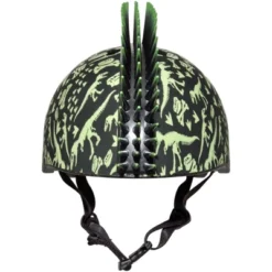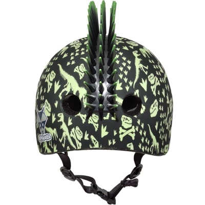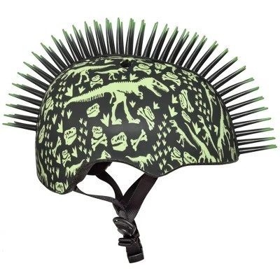 Make a ferocious statement with the Raskullz T-Rex Bonez Mohawk toddler bike helmet. This dinosaur-inspired bike helmet has bright green dinosaur skeleton images printed over the entire helmet and features an eye-catching 2” tall bendable black 3D mohawk with bright green tips. Perfect for tearing it up like a dinosaur on a bike, scooter or skateboard. Recommended for ages 3–5 years old, but will fit most heads measuring 48–52 cm/18.9–20.47 in. Always take a head measurement. Head sizes and shapes can vary, even within an age range. Complies with the U.S. CPSC Safety Standard for Bicycle Helmets for Persons Age 1 and Older (Extended Head Coverage).