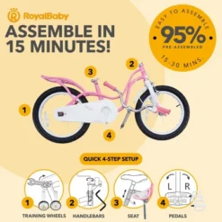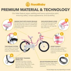 Allow your little one to experience the joy of riding with the RoyalBaby Princess Girl Bicycle, the perfect companion for young adventures. This beautifully designed bike is sure to catch everyone’s eye and make your little one feel like royalty on wheels. The adjustable handlebars and quick-release seat allow easy customization, ensuring a comfortable fit as your child grows. Sturdy training wheels provide stability for beginners, making the learning process smooth and enjoyable. As confidence builds, the training wheels can be removed, transforming the bike into a 2-wheeler for advanced riding. Safety is paramount with the RoyalBaby Princess Bike featuring a robust frame and enclosed chain guard to protect little fingers while the reflectors and bell ensure visibility during riding. Non-slip pedals and durable tires offer excellent grip and control, allowing your child to navigate various terrains with ease. The Princess Bike includes a charming basket, perfect for carrying toys, snacks, or treasures found on adventures to encourage imaginative play. Assembling the bike is a breeze with the included tool kit and easy-to-follow instructions. The durable construction ensures it will withstand the test of time and active play, making it a reliable choice for your child’s first bicycle. The RoyalBaby Princess Girl Bicycle is more than just a bike; it’s a gateway to adventure, independence, and joy. Watch your child’s face light up with excitement as they pedal their way to new adventures.