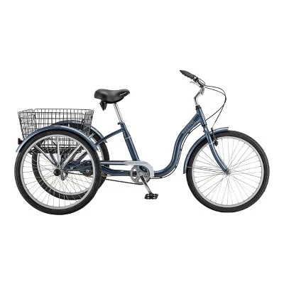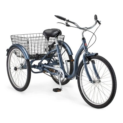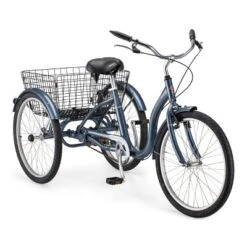 Ride with confidence and style on the Meridian tricycle by Schwinn. This full-sized tricycle is perfect for those who want to enjoy the outdoors. The Meridian’s stylish three-wheeled design provides more stability than a bicycle, while the step-through aluminum frame provides a low stand over height, making it easier to get on and off. Its single-speed drivetrain, front linear pull brake, and rear drum brake make it simple to use. Plus, this tricycle’s upright riding position and springer cruiser saddle make it a joy to ride. And don’t forget – the rear folding basket has plenty of room for cargo, like a backpack, bags of groceries, and more. (Note: the basket is not suitable for children, pets, or other passengers.) Experience the joy of cycling like never before with the Meridian tricycle. Enjoy the freedom of riding a Schwinn.