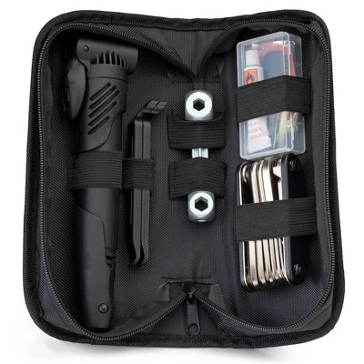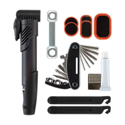 Never be caught without the right tools again! The Schwinn Emergency Repair Kit for bicycles makes it easy to perform roadside repairs. This 12-piece kit includes an expanding mini pump, 15-in-1 multi-tool, 10-function wrench, 2 tire levers, and a tube patch kit. Plus, it all comes in a convenient carrying case. Upgrade your ride with the Emergency Repair Kit and enjoy the freedom of riding with Schwinn.