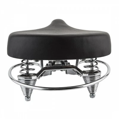 SADDLE SUNLT CRUISER CLASSIC w/HANDLE BK Dual spring saddle with chrome grab bar and vintage feel. Chrome front spring and dual rear springs offer a plush comfortable ride. Heavy duty vinyl top resists tearing and scuffs. Pillar style seat post clamp. 11.5` x 8.5`.