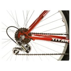 Titan Pathfinder Men’s 18-Speed Bike. Features 18-Speeds, POWER derailleur’s, 26-Inch Alloy Wheels/Tires/Tubes, Steel Hubs, Steel Spokes, Quick release adjustable two-tone saddle, Grip shifter gear changing system by POWER, Front suspension fork, Steel Bike Frame, Steel POWER v-brakes front and rear, Candy Apple Metallic Paint, & Front Wheel Retainers. Assembled dimensions are 65 x 24 x 37. Arrives 85% Assembled, light assembly required. Wash with Cloth and Warm Water. Made in China. 1 years warranty against defects.
