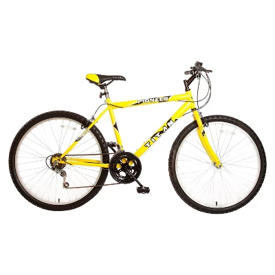 Bring your workout outdoors with this blue Pioneer mountain bike from Titan. With an 18-inch steel frame, it features 26-inch alloy rims, 12-speed gearing, steel side-pull brakes and an adjustable saddle seat.