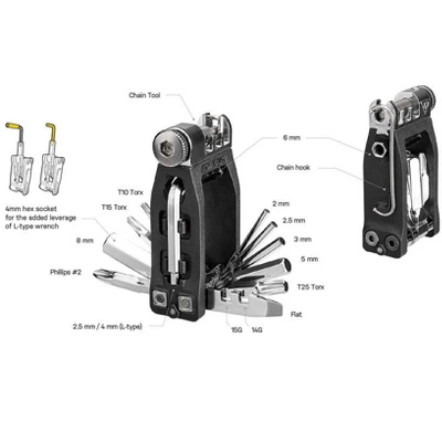 Mounts under Ninja water bottle cage with interchangeable Cage Mount or use alone with Frame Mount. This weatherproof tool box contains an 18 function mini tool for basic repair and maintenance. Mount to Ninja Master+ series cages with included cage mount, or install on frame, stem, seatpost, or water bottle boss with included frame mount and zip ties . 2 / 2.5 / 3 / 4 (L-type) / 5 / 8 mm Allen wrenches, 6 mm hex tool bit . T10 / T15 / T25 Torx wrenches. #2 Phillips / flat head screw drivers. 14G / 15G spoke wrenches. Chromoly steel chain tool and chain hook. The chain tool is compatible with single and multi-speed chains up to 12 speed, NOT including Campagnolo hollow pin chains.