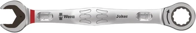 High quality, metric, combination ratchet wrench by Wera. Everything that a wrench has to be able to do. And a whole lot more. Faster, better, stylish. Yes, a real Joker. The new generation of combination ratchet wrenches. Suitable for hexagon socket screws, bolts or nuts. Comes with holding function, thanks to the metal plate in the jaw, which reduces the risk of dropping nuts and bolts. The replaceable metal plate in the jaw secures nuts and bolts with its extra hard teeth and reduces the danger of slipping. The integrated limit stop prevents any slipping around the bolt head and allows higher torque to be applied Practical holding function thanks to the metal plate in the jaw. Limit stop prevents any slipping. The double-hex geometry reduces the risk of slipping. Return angle of only 30 degrees. With Take it easy tool finder: color coding by size.