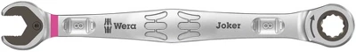 High quality, metric, combination ratchet wrench by Wera. Everything that a wrench has to be able to do. And a whole lot more. Faster, better, stylish. Yes, a real Joker. The new generation of combination ratchet wrenches. Suitable for hexagon socket screws, bolts or nuts. Comes with holding function, thanks to the metal plate in the jaw, which reduces the risk of dropping nuts and bolts. The replaceable metal plate in the jaw secures nuts and bolts with its extra hard teeth and reduces the danger of slipping. The integrated limit stop prevents any slipping around the bolt head and allows higher torque to be applied Practical holding function thanks to the metal plate in the jaw. Limit stop prevents any slipping. The double-hex geometry reduces the risk of slipping. Return angle of only 30 degrees. With Take it easy tool finder: color coding by size.