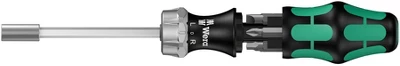 Wera compact tool with multi-component Kraftform handle for high working speeds and particularly ergonomic screwdriving. Integrated bit magazine in the handle. Includes ratchet: fine-pitched for small return angle, switchover ring (right, fixed, left), maximum torque of up to 50 Nm; hexagonal blade with 1/4″ hexagon socket take-up, stainless sleeve, strong permanent magnet. Kraftform Kompakt with ratchet function for high working speeds. Kraftform with anti-roll feature, multi-component, integrated magazine. Fine-pitched teeth for small return angle; switchover ring (right, fixed, left). Maximum torque of up to 50 Newton meters.