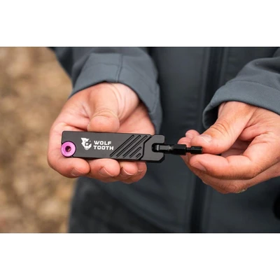 The new Wolf Tooth 6-Bit Hex Wrench is a slim, strong multi-tool with 11 functions for common bike repairs and everyday needs. Six hex bits are stored inside the handles that fit into the end of a ball detent swivel head for use. It is small enough to fit into a riding tool wrap or pocket, and has an optional key ring attachment to fit on any keychain for use away from the bike. Six bits with eleven functions: 2, 2.5, 3, 4, 5, 6, and 8mm hex; flat head #3.5 and Phillips #2 screwdrivers; and T10 and T25 Torx-compatible bits. All bits are ED-coated and corrosion-resistant. Magnets keep all bits in place and secure. Ball detent swivel head tested to over 40Nm of torque. Same bits as 8-Bit System and EnCase System multi-tools. Replacement parts available.