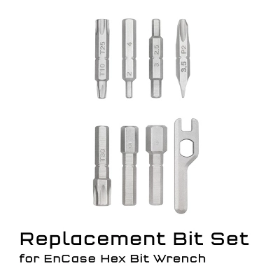 Replacement parts and extra supplies for the EnCase System. Bacon Strip plugs store inside handle of the EnCase System Chain + Tire Plug Multi-Tool. The Presta Valve Core and Presta to Schraeder adapter and Master Links store in EnCase System Storage Sleeves bonus area.
